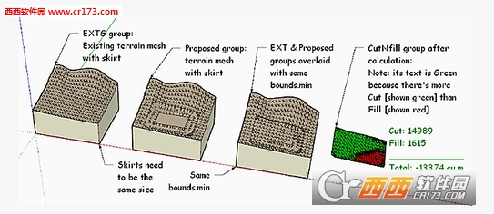 cutnfill是一款不收费的sketchup土方开挖及填充的插件,这款插件主要用于地形变化之后,可以直观显示出土方的开挖及填充部分,并计算出开挖及填充量。