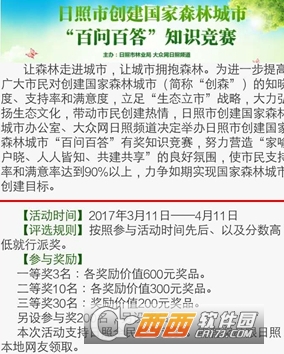 让森林走进城市,让城市拥抱森林。据了解,本次常识竞赛围绕创建国家森林城市的重点常识,在山东24小时手机推广客户端日照板块和日照大众网公众微信号同步拓展,题目种类多样、形式新颖、奖品丰厚。
