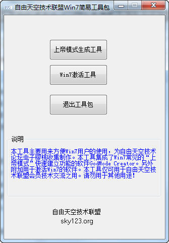 自由天空技术网盟Windows 7浅易工具包主要用来便捷Windows 7用户的用法,本工具集成了Windows 7容易见到的“上帝模式”迅速打造功能的软件GodMode Creator