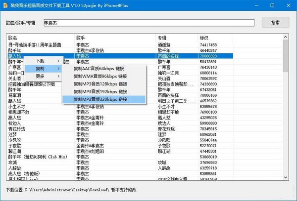 酷我音乐超品音质文件下载工具是一款酷我音乐的高质量音频下载工具,支持320kbps、192kbps、128kbps、96kbps、 64kbps、MP3、WMA、aac文件下载,目前QQ音乐的歌曲,酷我酷狗也有并且也能下载,等于酷我可以下载到QQ音乐的歌!