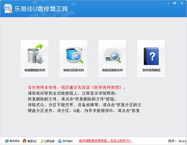 乐易佳U盘修复工具是现在市面上最棒的一款U盘修复软件,可以最大程度上恢复U盘设施的损毁或者是人为误操作与病毒入侵导致的U盘数据丢失问题。乐易佳U盘修复工具完美兼容全线Windows系统,支持U盘设施,FAT16、FAT32、NTFS、exFat等多种文件系统,与数百种的文件格式,可以急速扫描,速度可以达到U盘读取数据的极限,智能剖析迅速解决,迅速数据恢复与深度数据恢复相结合,最大程度上恢复数据,绝不含糊。乐易佳U盘修复工具界面设计美观,操作简单,仅需简单的几个步骤就能迅速的帮你活恢复数据,提升你的工作效率,让你不再忧心,欢迎有需要的下载体验!