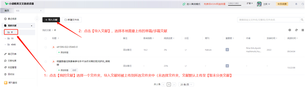 在导入文献前,点击【我的文献】选择具体的文件夹,可以将文献上传至该文件夹中;不选择具体的文件夹,文献将被上传至【我的文献】里面。