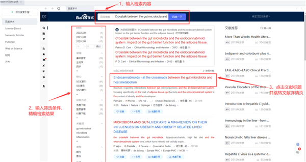 1、【检索与筛选】:输入关键字并检索后,可通过点击筛选条件提高检索精度与效率。