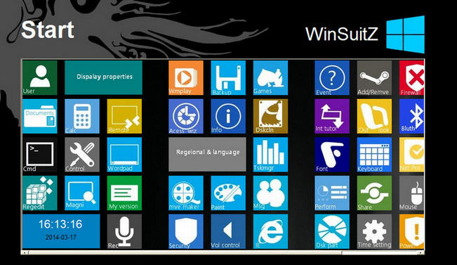 提供了一键常用工具,如计算器,命令控制台,写字板,注册表编辑器,放大镜,远程桌面连接,Windows媒体播放器,Internet Explorer或画图的访问。假如你比较喜欢win8开始菜单,但又讨厌win8系统,那样你可以通过WinSuitZ软件来模拟win8开始菜单