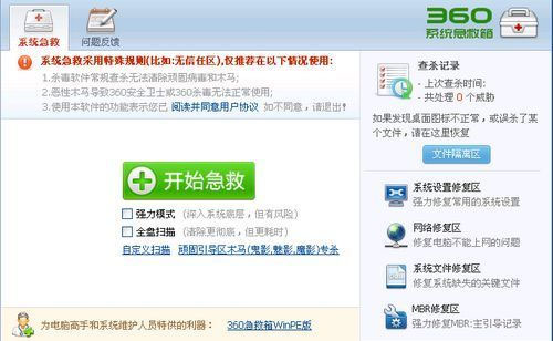 3、若满足,则可开始用系统急救,360系统急救箱为用户提供了三种急救办法及一种专杀功能,包含强力模式、全盘扫描和自概念扫描,及顽固引导区木马专杀,用户可依据我们的需要自行选择,其中强力模式可深入系统底层进行扫描,但有风险,全盘扫描,清除更彻底,但更耗时4、完成点击“开始急求”即可