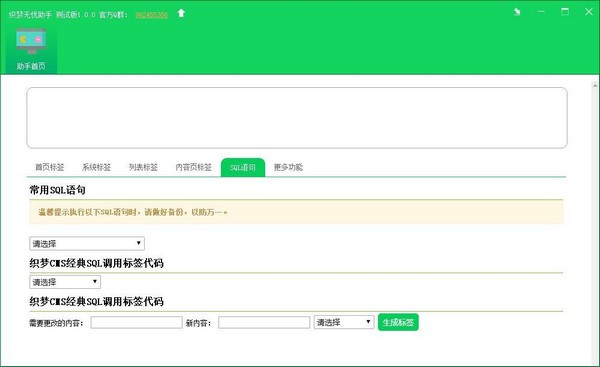 DEDE无忧助手免费版是一款优质出色的网页标签生成工具。DEDE无忧助手由首页标签、系统标签、列表标签、内容标签、SQL语句等多个功能页面组成,可以配合DEDE模板用,便捷用户对网页进行归类管理。
