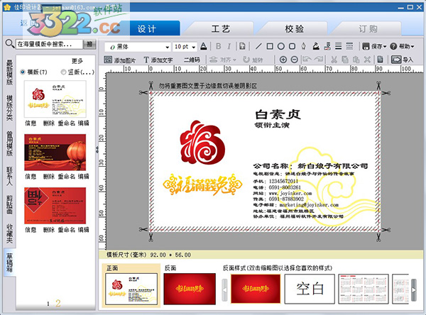4、商品设计:依据需要选择设计品项,在模板的分类中选择自己喜欢的模板,应用佳印名片设计器设计个性化商品;或者自行导入已有设计,仅需容易上传订购,佳印网将会为你提供优质的印刷服务。