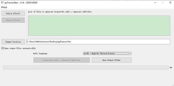 3、点击Output Location可以更换转转成字幕后储存的地方,预设为桌面的PyTranscriber资料夹。都好了之后,就点击下方Transcribe Audio/Generate Subtitles 开始转换:
