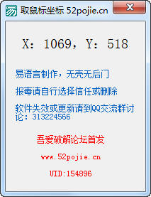 吾爱取鼠标坐标是一款获得鼠标坐标辅助工具。非常简单的一个小工具,易语言写的,可以获得鼠标所在地方的坐标。