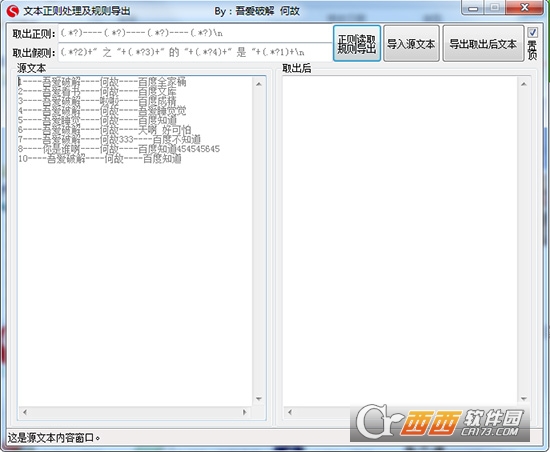 文本正则处置及规则导出工具是一款十分专业的文本处置小工具,支持文本文档批量导入导出,取出用正则获得,导出用的是作者开发的家规则,也可以称之为假则,也可以自概念操作,有兴趣的朋友可以试一试。