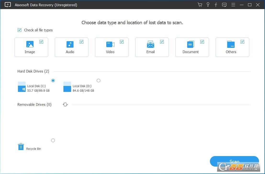 步骤2.选择丢失的数据种类和磁盘驱动器,然后开始扫描已删除的文件。
