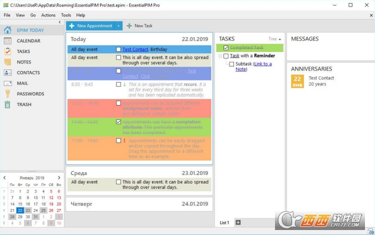 EssentialPIM Pro是一套免个人时间日程安排软件,它具备相当便捷的操作接口,让用户可以对于所排定的行程一清二楚,而每个事件也都允许用户进行记档,叫你可以把比如会议结果,计划案等数据附带于该记录中。往后,用户就可以直接对所输入的数据进行搜寻,叫你不论在何时都可以找到该事件发生时的一些特定信息。