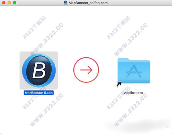 2、然后会出现一个弹窗示意大家将“MacBooster 5.app”拖入到应用程序的文件夹中,大家照做,将它拖入进来即可