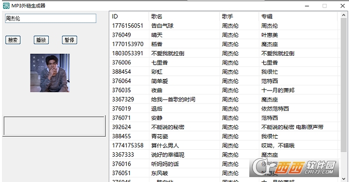 MP3外部链接生成器支持搜索歌曲名字、歌手、支持在线试听右击可以获得外部链接地址等功能。