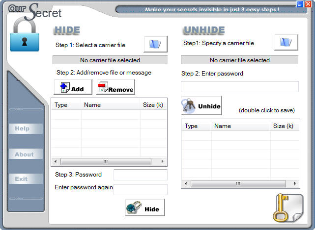 假如你的电脑里也有一些秘密文件或一些你懂的文件不想公开或共享,记者介绍一款软件:Our Secret,它可以轻松把秘密的文件等藏进叫你看得到的图片、视频、文件等文档里面,变成变成只有你了解的私密文档,当然也只有了解密码的人才能解开。