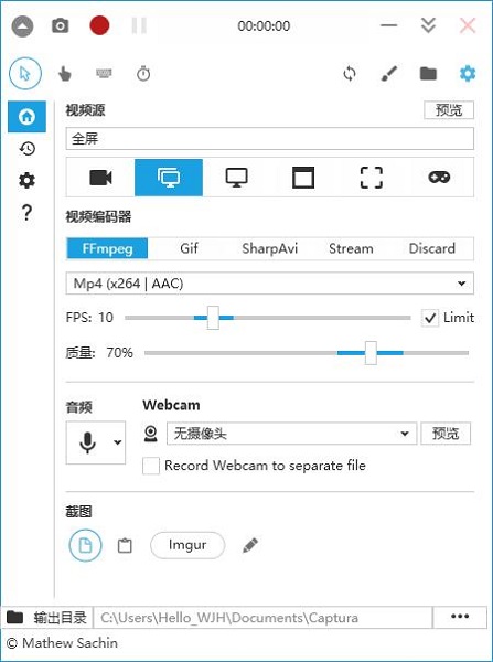Captura在视频设置中,选择录制地区,视频编码器,帧率及水平。在视频上方,可以看到鼠标、手指等图标,它们的激活状况可以决定视频会不会显示鼠标、鼠标点击痕迹、按下的键盘按键等信息。