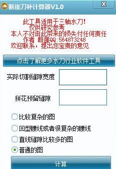 断崖刀补计算器是一款针对CAD所推出的刀补辅助小工具。这款刀补计算器适用于三轴水刀,能通过容易的计算方法,轻松计算出精准刀补数值,让工作效率大大提高!【使用详解】1、下载并打开断崖刀补计算器2、输入数值,选择计算种类,点击计算即可