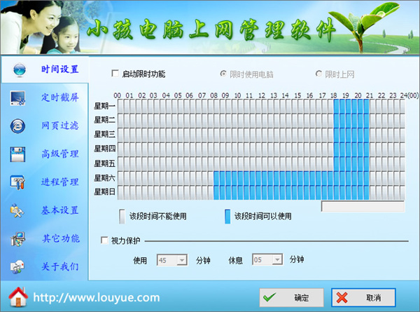 楼月孩子电脑上网管理系统是由楼月软件开发公司推出的一款管理孩子上网的实用工具。内置了父母和孩子模式,包含多种管理方法,像上网限制时间设置,有效地控制孩子的上网时间。支持定时截屏,健康孩子在看什么,网页过滤功能则可以预防孩子上一些不好的网站,将他们屏蔽,高级管理设置提供一些注册表编辑控制、任务管理器的用法,依据需要来设置。楼月孩子电脑上网管理系统自带密码开启,无密码没办法打开,很好使,目前孩子长期上网会紧急不利于身心健康,所以控制孩子的时间很有必要,推荐给各位父母和有关管理职员用,欢迎下载体验。