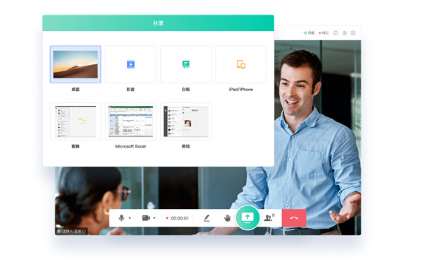 其他人从任何端可发起共享,共享程序、影片、白板、桌面及手机