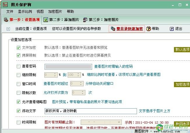 图片保护狗是专门针对Bmp、Jpg等图片进行加密的软件。它集成了文件加密、访问口令、视图缩放限制、防拷屏、时间限制等功能,可以有效的保护图片作者的权益。软件使用一流的加密技术,复杂的加密算法,同时又优化了图片显示速度和显示模式,是出色的图片加密与发布软件。软件功能:文件加密、拷屏限制、授权打印、图片查询密码设置、缩放保护、浮动文字、图片有效期限制、窗口时间限制、查询次数限制。