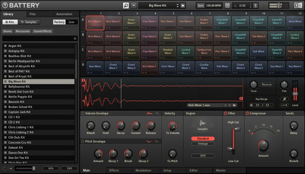 battery 4是由Native Instruments公司推出的一款综合鼓音源,是专为 21 世纪设计的尖端鼓采样器。软件以电鼓为主,库中含有 143 款素材,专注于电子及hip hop 风格制作。 更有70款出色的鼓素材添加入 BATTERY 珍藏夹,相当合适于进行现代制作。 简单易用的标记式浏览器能帮你迅速找到鼓声,然后仅需拖动入 cell,即可开始演奏。Battery以其极其出色的音质和高效的工作步骤而著称,拥有明确、引人入胜的界面,让你近在咫尺,为将来带来鼓采样,其官方口号是“重概念鼓采样”。此外,软件结合了一个为电子和嘻哈音乐量身打造的增压库,与一个很直观的工作步骤,专注于创造力。同时,这款软件具备迅速访问控制和直观的手势界面,涵盖导航,编辑,循环,调制等功能,用基于标签的新浏览器即时查找和排列声音,并通过容易的拖放操作来路由强大的新成效。
