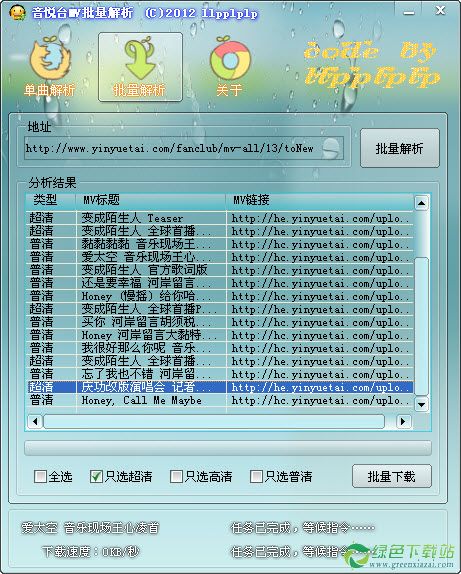 分析完毕后可以单击选择想要下载的MV后点击批量下载,也可以点只选高清、只选好看的、只选普清或全选下载。
