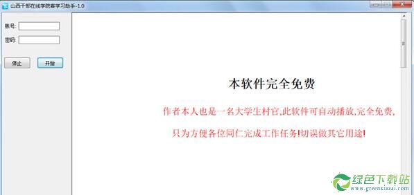 山西干部在线学院客学习助手帮助山西干部在网上迅速在线学习,让用户轻松的进行挂机学习,省去手工操作的烦恼。【软件功能】1、登录帐号,点击开始即可2、若用IE浏览器在山西干部在线学院远程学习时正常学习时课程繁多要过一段时间后要手工点换课程,不然网站会停止学习计时。