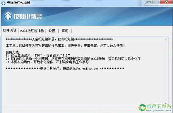 天猫抢红包助手是一款抢红包脚本,本工具以按键精灵为开发环境的绿色脚本,绿色安全,无毒无害,你可以放心用。