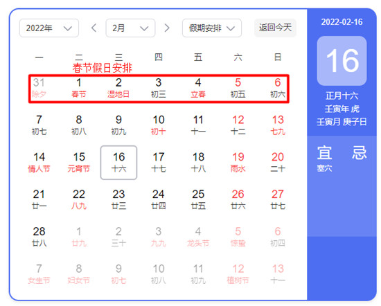 2、【新年】2022年1月31日(除夕、周一)-2022年2月6日(初6、周日),共放假7天,其中2022年1月29日(周六)、2022年1月30日(周日)正常上班调休。