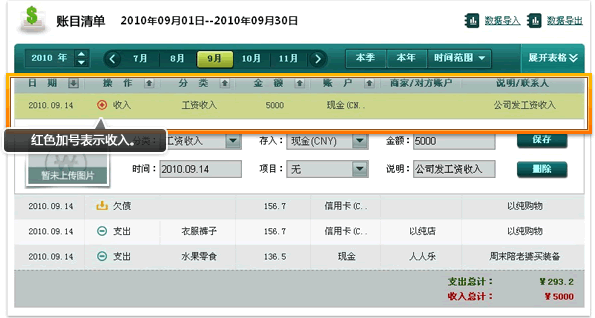 上班一族,每一个月都会拿到一个月的薪资,这个时候记在收入里面就能了。在页签处选择收入,点击暂未上传图片即可上传你的工 资条,也可不必上传。分类处选择你收入分类,账户可选择的薪资发放的形式,如银行卡或现金,录入金额5000元,时间选择你 领取薪资的日子,项目可不填,在说明那里备注一下收入的来源说明,点击新增记录按钮即可记一笔收入