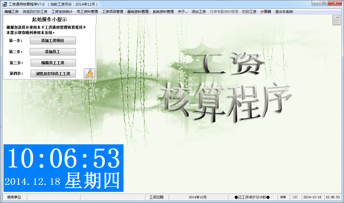 本系统默认的操作密码为888,你可以在进入本系统后修改操作密码,以保密本系统的薪资资料。在设定密码时,不要将密码设为空,假如将密码设为空,系统将不可以登录。