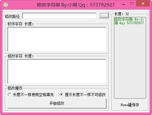 小湖修改字符串是一个字符串修改工具。是易语言软件,小湖修改字符串支持快捷键:Home键对着,要修改的字符按Home键就会自动保存下来,主要用于编程,定义说明、函数讲解,可用于修改字符串只支持没加壳的文件。