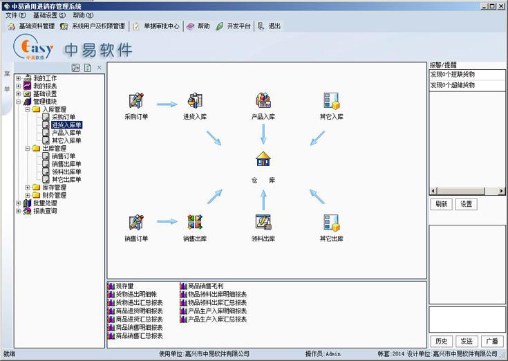 1、提供仓库平时管理中的入库和出库功能,出入库数据、现存量的统计,提提供收应对款管理,现金银行帐户管理。