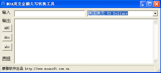 本程序由摩雅软件开发。你仅需输入阿拉伯数字,选择币种,即可生成你需要的货币英文大写。对于做外贸合同和发票很省力省心