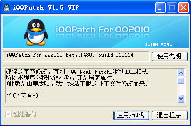 把本程序移到QQ安装目录的bin文件夹下,打开,打上补丁(卸载和补丁是同一个按钮),剩下就是去Plugin文件夹任意篡改加载插件吧