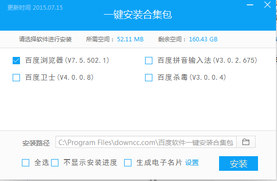 百度软件一键安装合集包为大伙整理了百度旗下的海量热点软件,单个下载百度的软件不只要去找,安装也麻烦,记者提供了百度官方推出的最新推出的一键安装包程序,包含百度拼音输入法、百度卫士、百度浏览器、百度杀毒、pptv等都可以安装,帮你一键安装各种电脑必须具备软件,让懒虫的你便捷快捷起来,电脑装机必须具备哟。