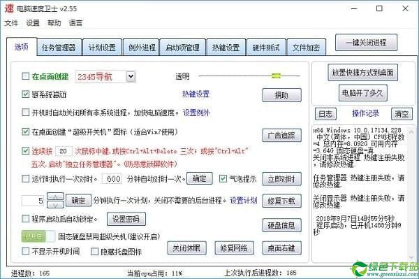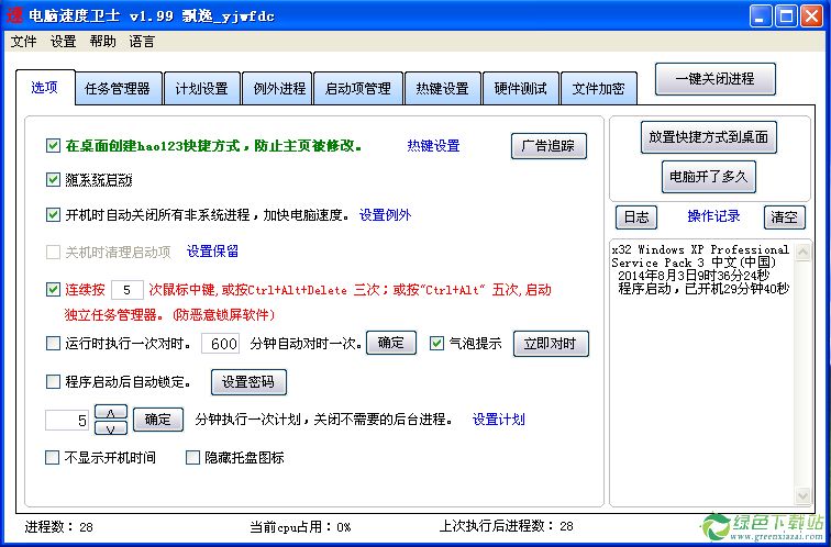 1.独创功能:智能关闭后台进程.用于管理各种播放软件的后台程序。当电脑安装某些播放软件,每次开机就会有一些后台程序启动,在后台上传、下载。占用电脑的互联网等资源,令到电脑互联网卡,速度慢。2.独创功能:独立任务管理器,突破恶意锁屏软件,按鼠标中键三下,会切换到独立任务管理器,显示隐藏进程。3.独创功能:快捷键或右键运行QQ,想运行QQ时,无需到处找QQ了.快捷键启动TM4.一键关闭进程,用于修复加了不少启动项的电脑,一键关闭所有非系统进程后就能清理电脑了。5.自动互联网对时,连接网上时间服务器,自动校准电脑时间。6.Alt+Ctrl+M快捷键或右键“关闭屏幕”节电功能。7.显示开机所需时间,最准确的开机时间计算软件。8.独创功能超级开关机,模拟Win8的开关机方法,Windows 7开机快一倍。还可以让win8和win8.1真的关机。9.启动项管理和服务管理,调用的是系统自带的"系统配置实用程序"10.CPU性能测试,准确对比不同cpu的性能;cpu内存重压测试,测试cpu与内存稳定性。11.批量高速加密文件,全世界最快的加密软件。1g文件加密不需一秒,小心记录密码,假如忘记了密码,破解需要100万年。12.广告追踪功能,追踪不明广告程序地方,显示网页广告地方。13.磁盘主引导区修改功能,主要用于被病毒修改MBR的修复.14.电脑速度卫士可以在播放软件主进程没有后,自动关闭这类后台程序.还可以一键关闭所有无需的进程。