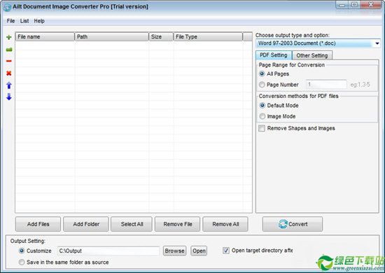 Ailt Document Image Converter Pro是一款专业易用的图像转换工具。有了这个强大的转换器,你可以在不一样的办公文件格式,PDF、网页、图像之间迅速转换。它可以支持全方位的格式:PDF、doc、docx、docm、rtf、xls、xlsx、xlsm、ppt、pptx、pptm、txt、htm、jpg、jpeg、bmp、emf、wmf、tif、gif、png、pcx、ico、j2k、jp2等。可以提供更多的设置选项,让你更准确地控制输出文件。