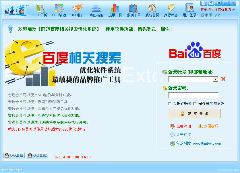 ★旺道网站优化工具用户是免费注册的,在旺道网站优化工具上进行注册操作,注册后可用基本的功能, 用户用时间越长,级别就越高,部分任务权限就越大。★免成本户只可以用Alexa流量功能与网站优化剖析功能.VIP用户可以用网站排名优化功能。