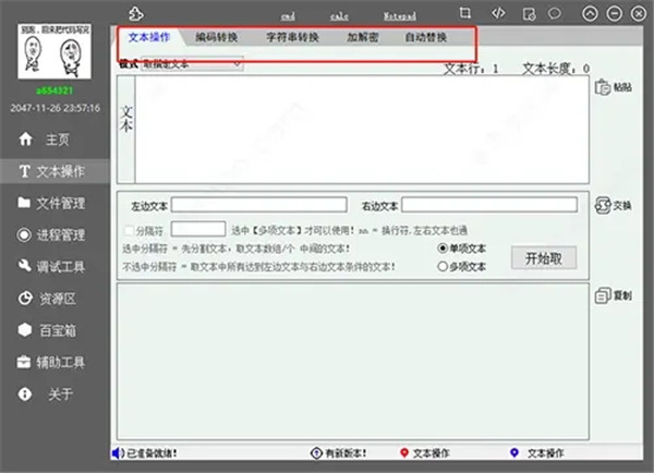 2、在文本操作中提供了文本操作、编码转换、字符串转换、加解密、自动替换等功能