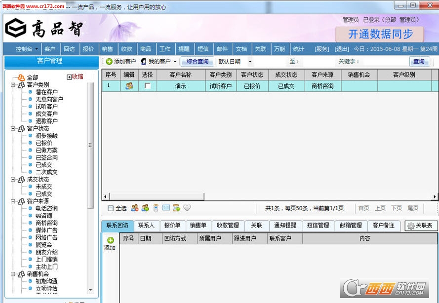 高品智CRM企业销售管理软件是一款销售版CRM专为中小微型企业量身开发的管理系统(20用户免费),最大的特点就是“万能自概念,高可扩展型,超灵活实用”,可以参考我们的业务特征,随便更改字段。本软件在管理顾客、回访、来电、销售、财务等很多方面提供多种解决方法,已经为50多种行业和10000多家顾客进行了信息化建设。