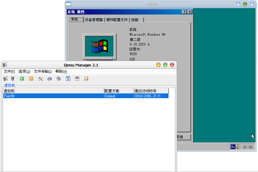 Qemu Manager For Windows 2.1 With QEMU 0.8.0 and KQEMU supportQemu 是一套可以在 Windows 操作系统中虚拟出另一套操作系统的虚拟机软件。由于它可以在系统中仿真出一颗虚拟的 CPU,然后将要虚拟的操作系统交给这颗虚拟 CPU 去处置,所以可以达到同一平台却可以同时实行两种操作系统的目的。
