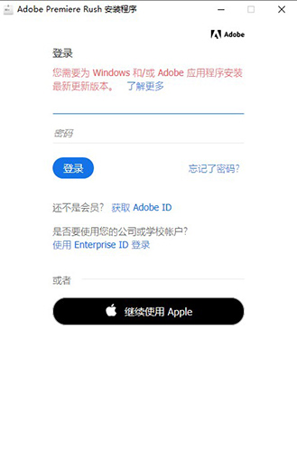 此次为你带来的是Premiere Rush CC 2020破解版,已经由大神完成破解,直接安装即可用,下文附带了详细的安装步骤,欢迎喜欢的用户下载体验。2、开始安装时,软件会需要登录Adobe账号,没账号的用户可以免费注册登录;