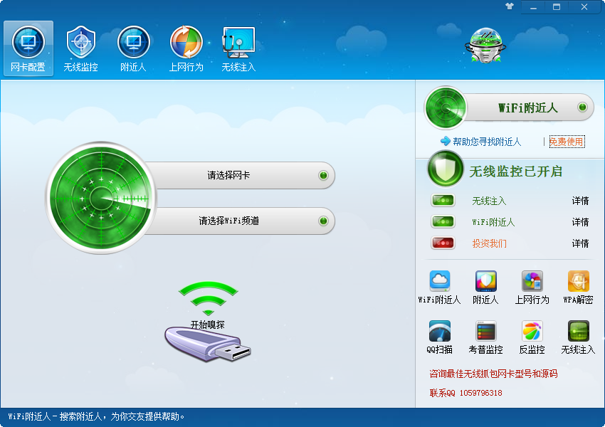 Wifi嗅探器可以从附近截获无线wifi信号,搜索附近人qq、朋友网、每人、微信等账号考普WiFi附近人。