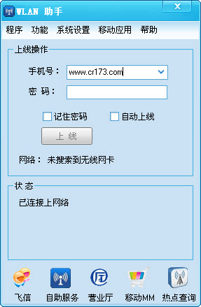 中国移动WLAN登陆软件,独立推广客户端,上线下线便捷;符合个人上网用习惯:不再打开网页输入账号密码,不再保留登陆页面;软件最小化到系统托盘,不多占用电脑桌面显示空间;不需要刻意下线,关机即可;